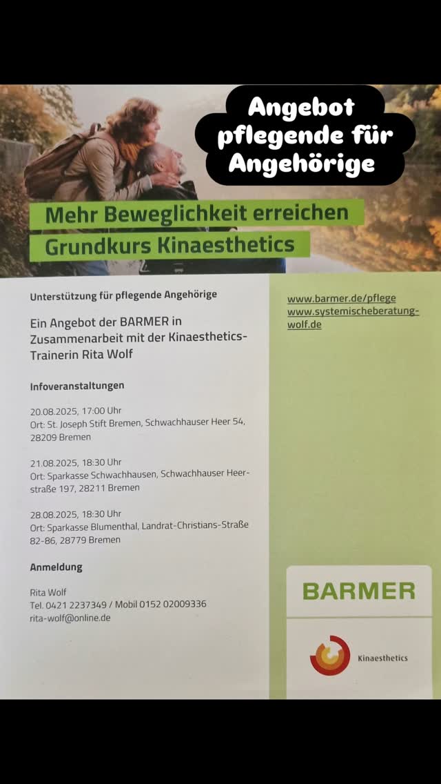 Im Verlauf des Seminars werden Ihnen anatomische Grundkenntnisse und erste ‚Werkzeuge‘ des Kinaesthetics Konzeptes vermittelt, die Ihren Pflegealltag erleichtern sollen. Im Mittelpunkt steht dabei die eigene Bewegung, die Sie anhand von Partnerübungen bewusst erfahren. Sie lernen, inwieweit die eigene Bewegung sich auf Ihre Gesundheit und die Ihres Familienmitglieds auswirken kann.